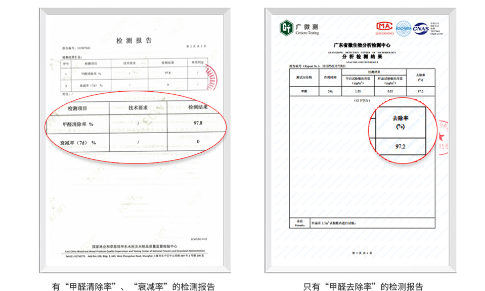 人造板甲醛清除劑的檢測(cè)報(bào)告,都會(huì)標(biāo)示出2個(gè)數(shù)值:一個(gè)是“甲醛清除率”,一個(gè)是“衰減率”;空氣凈化用甲醛清除劑的檢測(cè)報(bào)告只有1個(gè)數(shù)值:“甲醛去除率”。