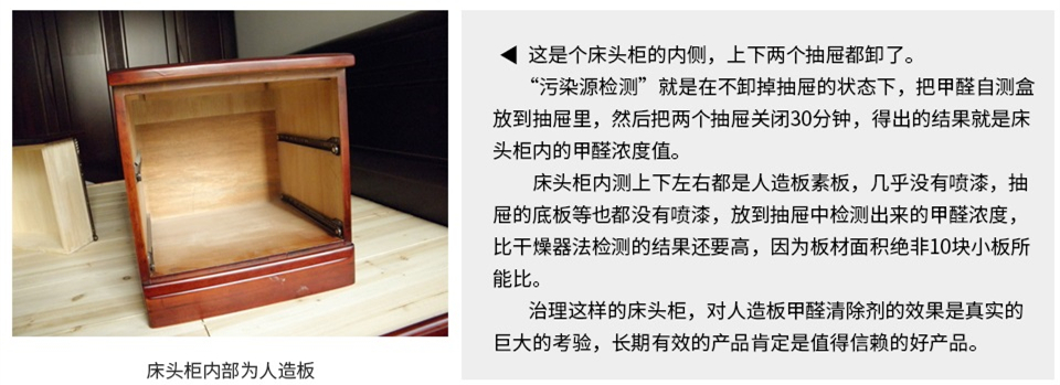 污染源檢測(cè)是我在2014年提出來(lái)的,既簡(jiǎn)單又實(shí)用的檢驗(yàn)除甲醛產(chǎn)品效果、確認(rèn)污染源的方法。污染源檢測(cè)就是用甲醛自測(cè)盒檢測(cè)家具內(nèi),找出那些甲醛超過(guò)0.3毫克、0.4毫克,甚至超過(guò)0.6毫克的家具,這些甲醛濃度高的家具就是污染源。