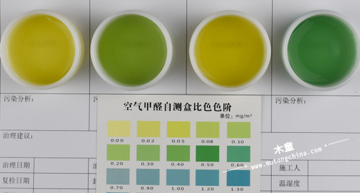 右上圖是客戶發(fā)來的檢測(cè)結(jié)果,圖中第三排兩個(gè)淺黃色的是房間內(nèi)的檢測(cè)結(jié)果,其他六個(gè)都是家具內(nèi)的檢測(cè)結(jié)果。家具內(nèi)甲醛明顯比房間內(nèi)高很多。