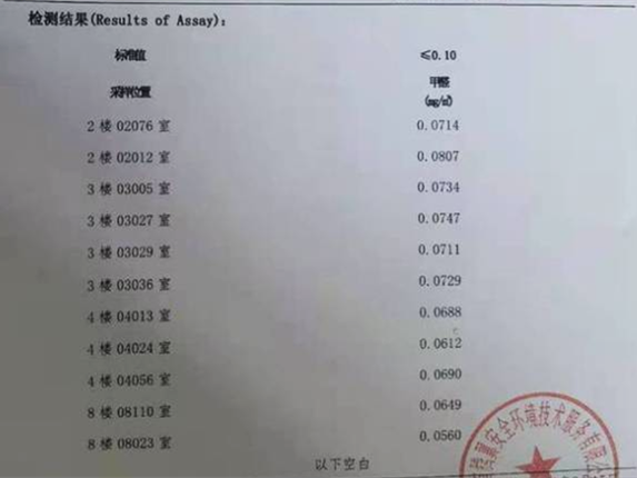 報告顯示了4個樓層11間宿舍的甲醛濃度值。樓層從高到低分別是8層、4層、3層、2層,大家可能已經發現,最高值在2層:0.0807,最低值在8層:0.0560。2層、3層檢測結果都高于0.07,4層、8層沒有超過0.07的。