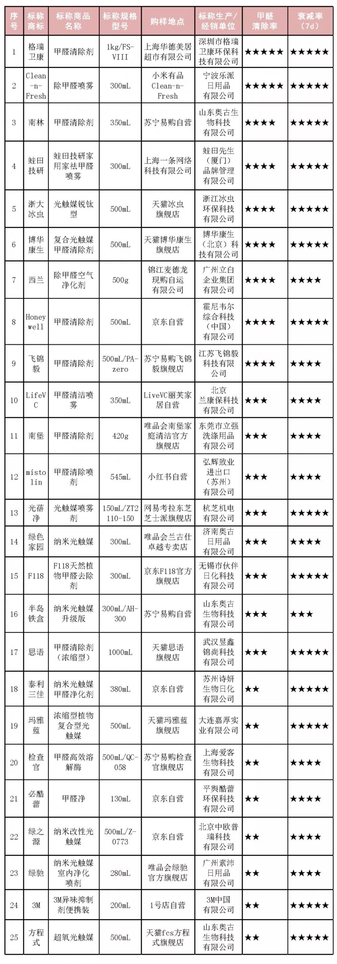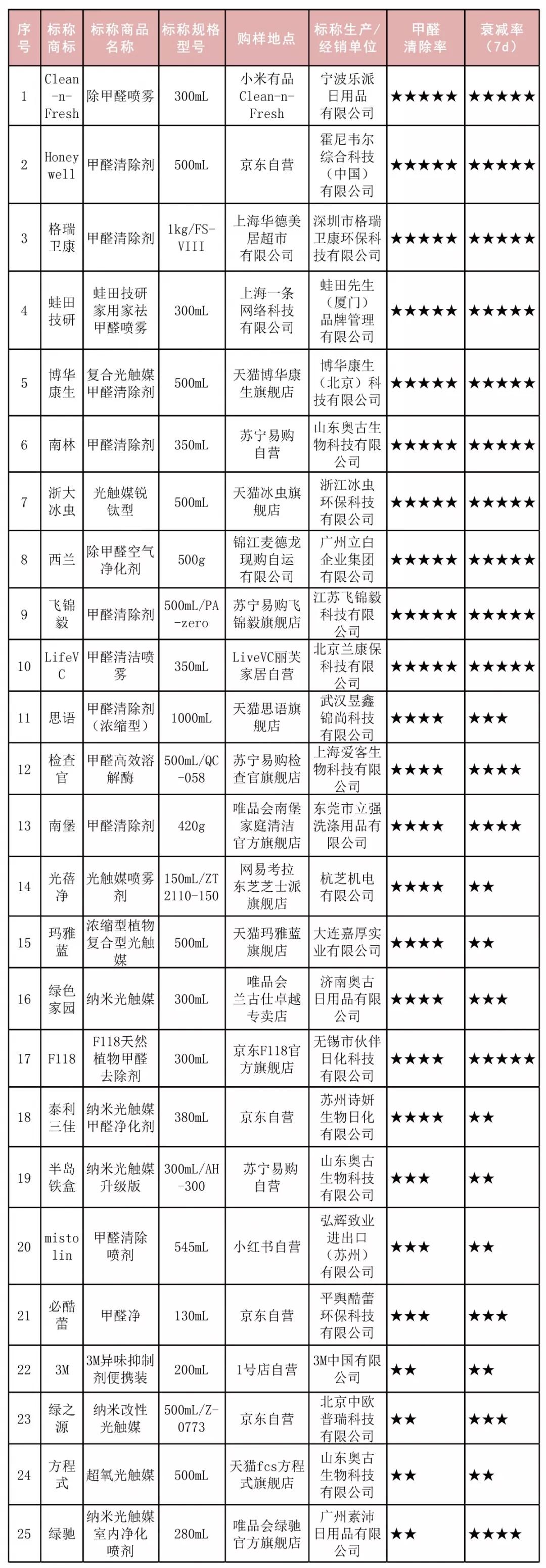 注1:甲醛清除率評分標準:5星:甲醛清除率≥75%;4星:50%≤甲醛清除率<75%;3星:25%≤甲醛清除率<50%;2星:甲醛清除率<25%。