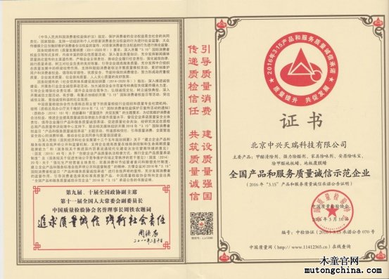 本次315活動之際,我北京中興天瑞科技有限公司的甲醛清除劑、強(qiáng)力除醛劑、家具除味劑、安居除味寶、除甲醛地板蠟、地板覆膜蠟等產(chǎn)品,經(jīng)過中國質(zhì)量檢驗(yàn)協(xié)會與國家質(zhì)檢總局質(zhì)量申訴處理中心的抽查評審,榮獲“全國產(chǎn)品和服務(wù)質(zhì)量誠信示范企業(yè)”。